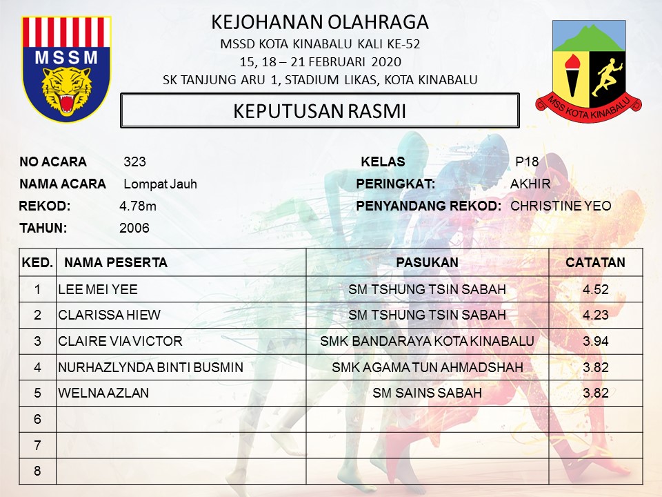 RASMI: LOMPAT JAUH P18TKB AKHIR Date: February 19, 2020 Author: Admin MSSDKK Comments: 0 Comments Categories: 2020RESULT, 2020RESULTSM, P18TKB, Sekolah Menengah Kongsi:
