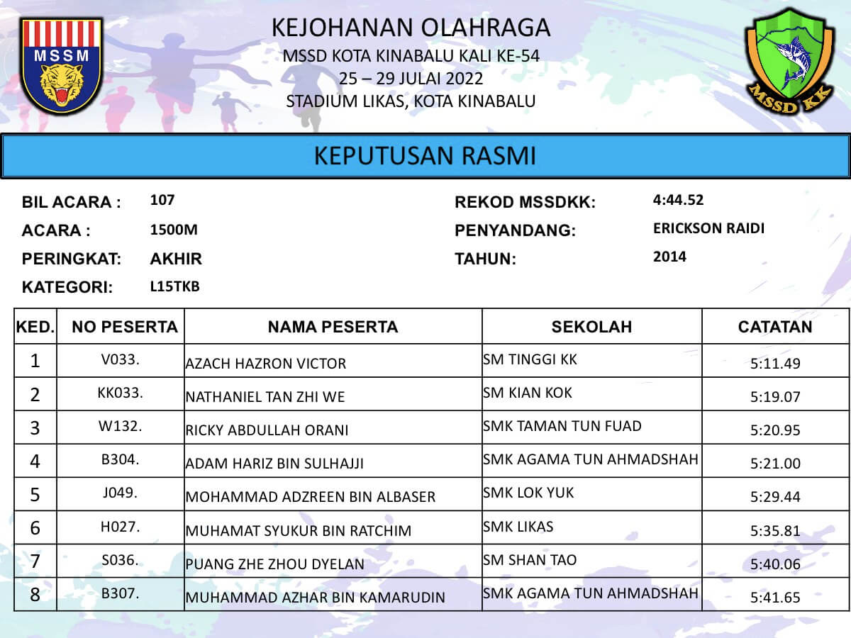 RASMI: 107 – 1500M L15TKB AKHIR Date: July 25, 2022 Author: Admin MSSDKK Comments: 0 Comments Categories: 2022RESULT, 2022RESULTSM, Sekolah Menengah Kongsi: