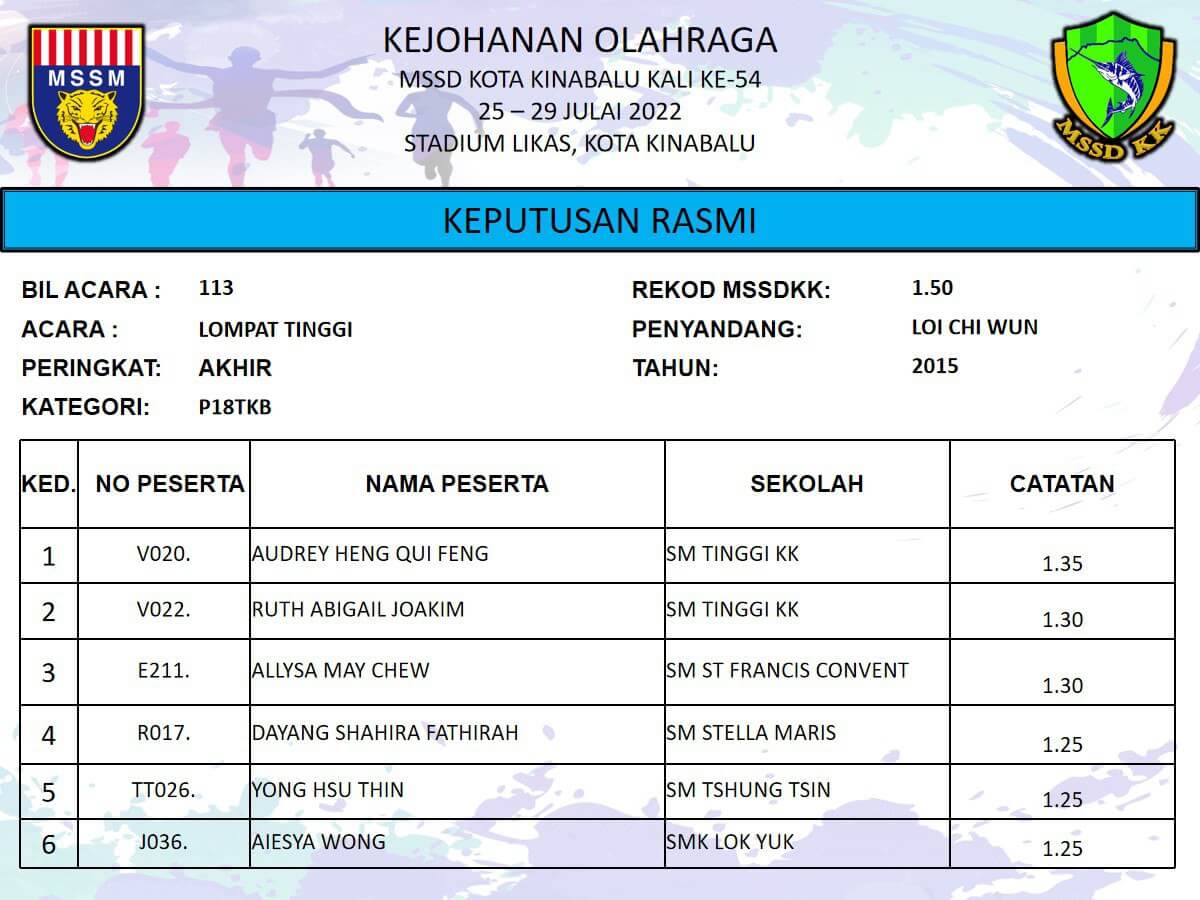 RASMI: 113 – LOMPAT TINGGI P18TKB AKHIR Date: July 25, 2022 Author: Admin MSSDKK Comments: 0 Comments Categories: 2022RESULT, 2022RESULTSM, P18TKB, Sekolah Menengah Kongsi: