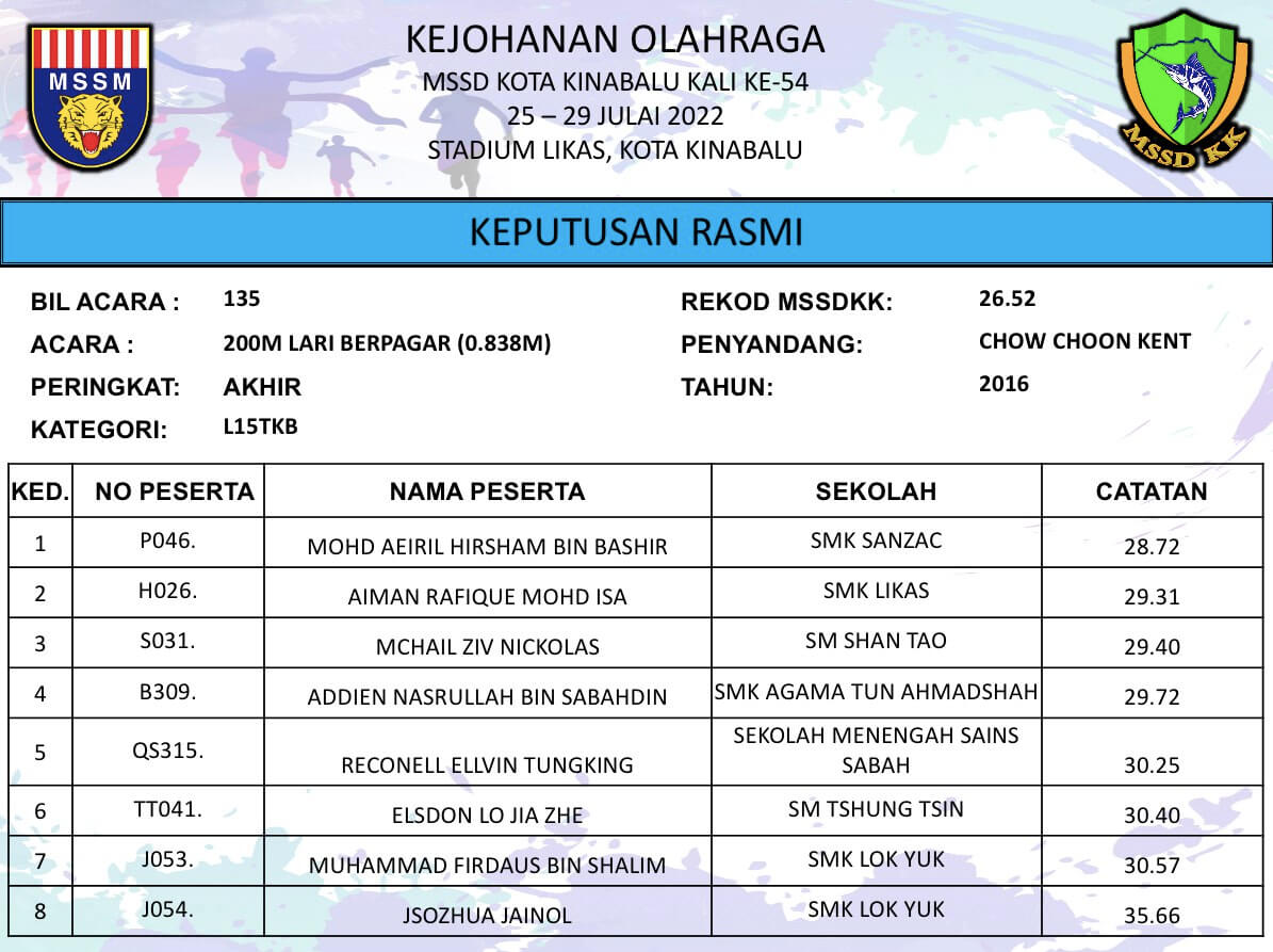 RASMI: 135 – 200M LARI BERPAGAR L15TKB AKHIR Date: July 26, 2022 Author: Admin MSSDKK Comments: 0 Comments Categories: 2022RESULT, 2022RESULTSM, L15TKB Kongsi: