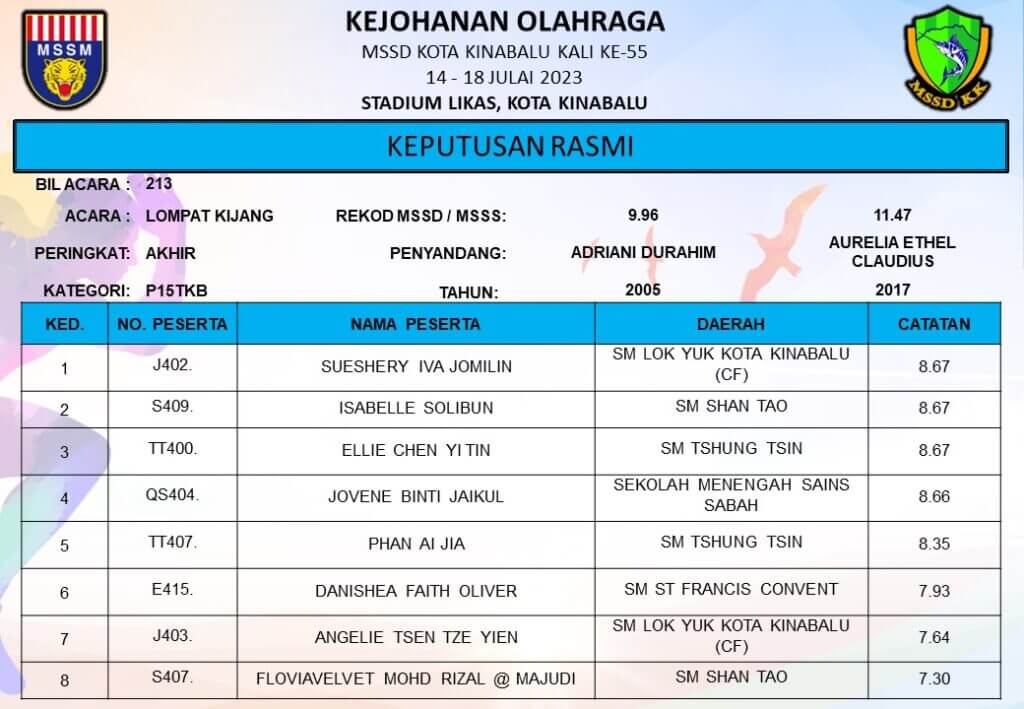 KEPUTUSAN RASMI: 213 – LOMPAT KIJANG P15TKB AKHIR Date: August 15, 2023 Author: MSSDKK Comments: 0 Comments Categories: 202315TKB, 2023RESULT, 2023RESULTSM, 2023TKB Kongsi: