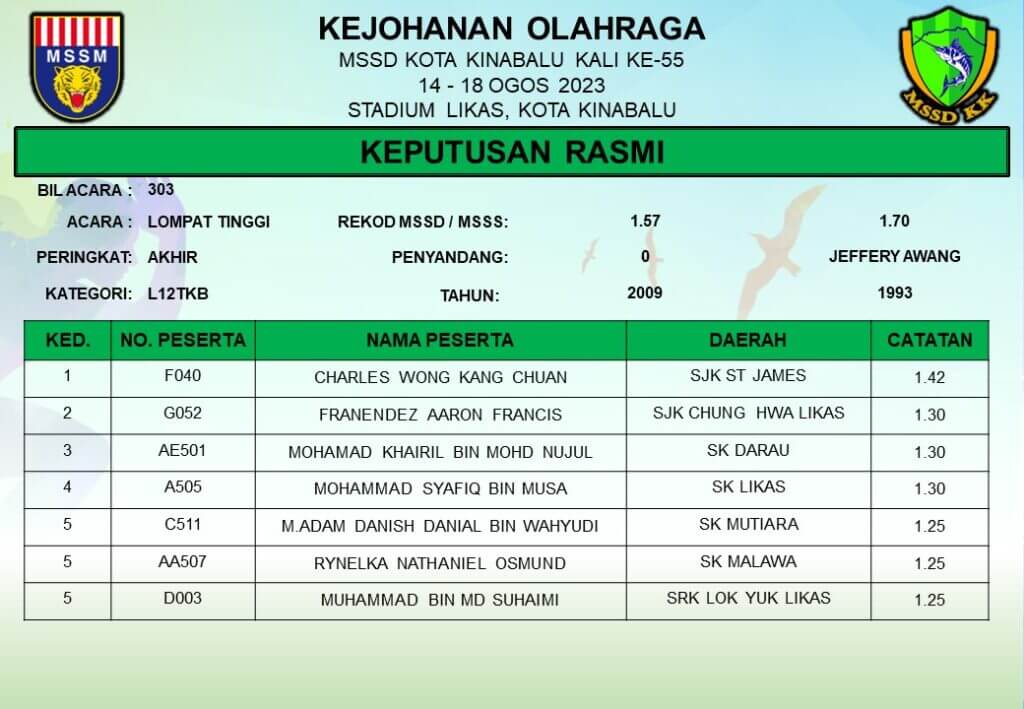 KEPUTUSAN RASMI: 303 – LOMPAT TINGGI L12TKB AKHIR Date: August 16, 2023 Author: MSSDKK Comments: 0 Comments Categories: 202312TKB, 2023RESULT, 2023RESULTSR, 2023TKB Kongsi: