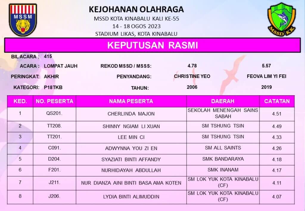 KEPUTUSAN RASMI: 415 – LOMPAT JAUH P18TKB AKHIR Date: August 17, 2023 Author: MSSDKK Comments: 0 Comments Categories: 202318TKB, 2023RESULT, 2023RESULTSM, 2023TKB Kongsi: