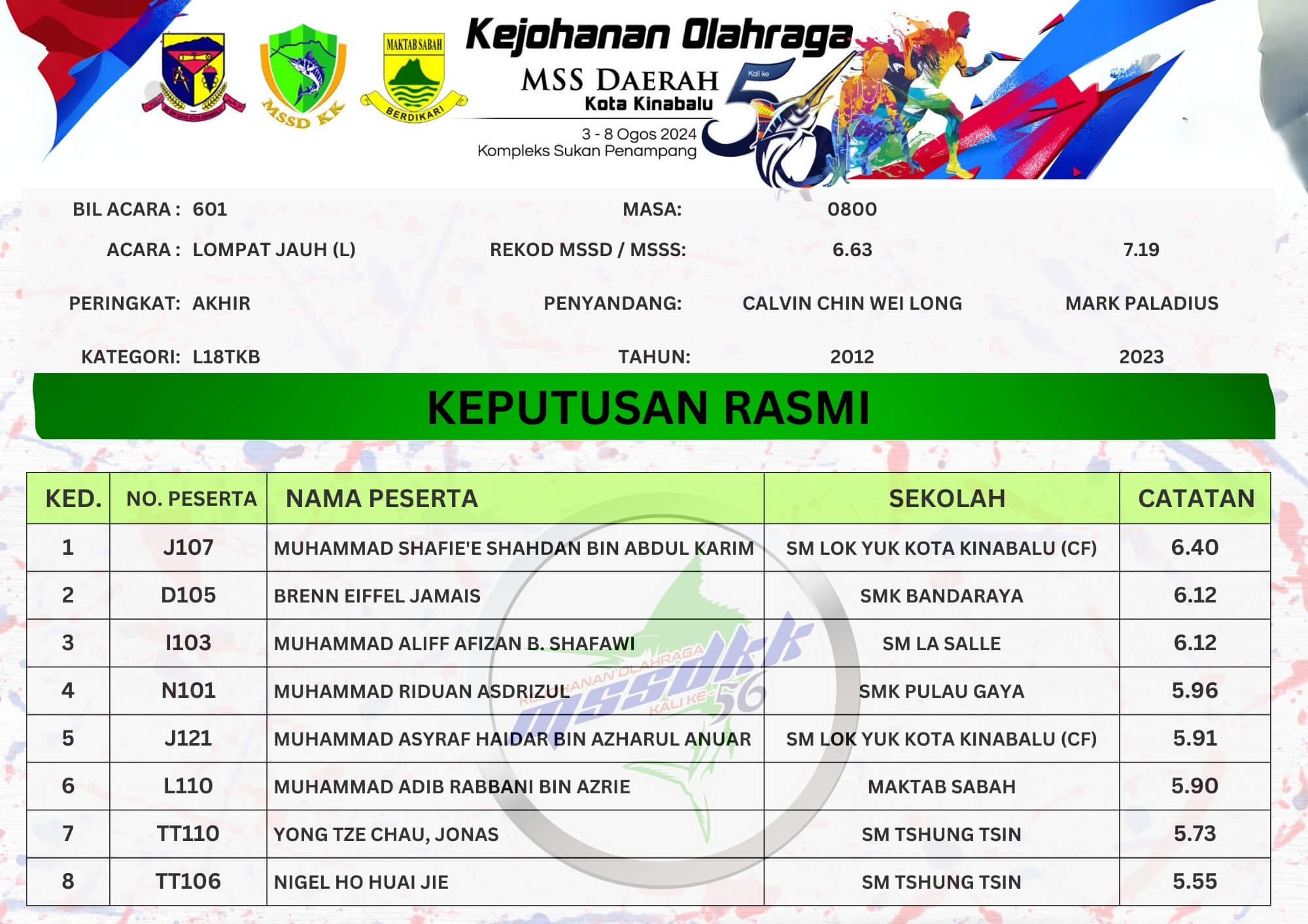 RASMI: 601 – LOMPAT JAUH L18AKHIR Date: August 8, 2024 Author: Admin MSSDKK Comments: 0 Comments Categories: 202418TKB, 2024L18TKB, 2024RESULT, 2024RESULTSM Kongsi: