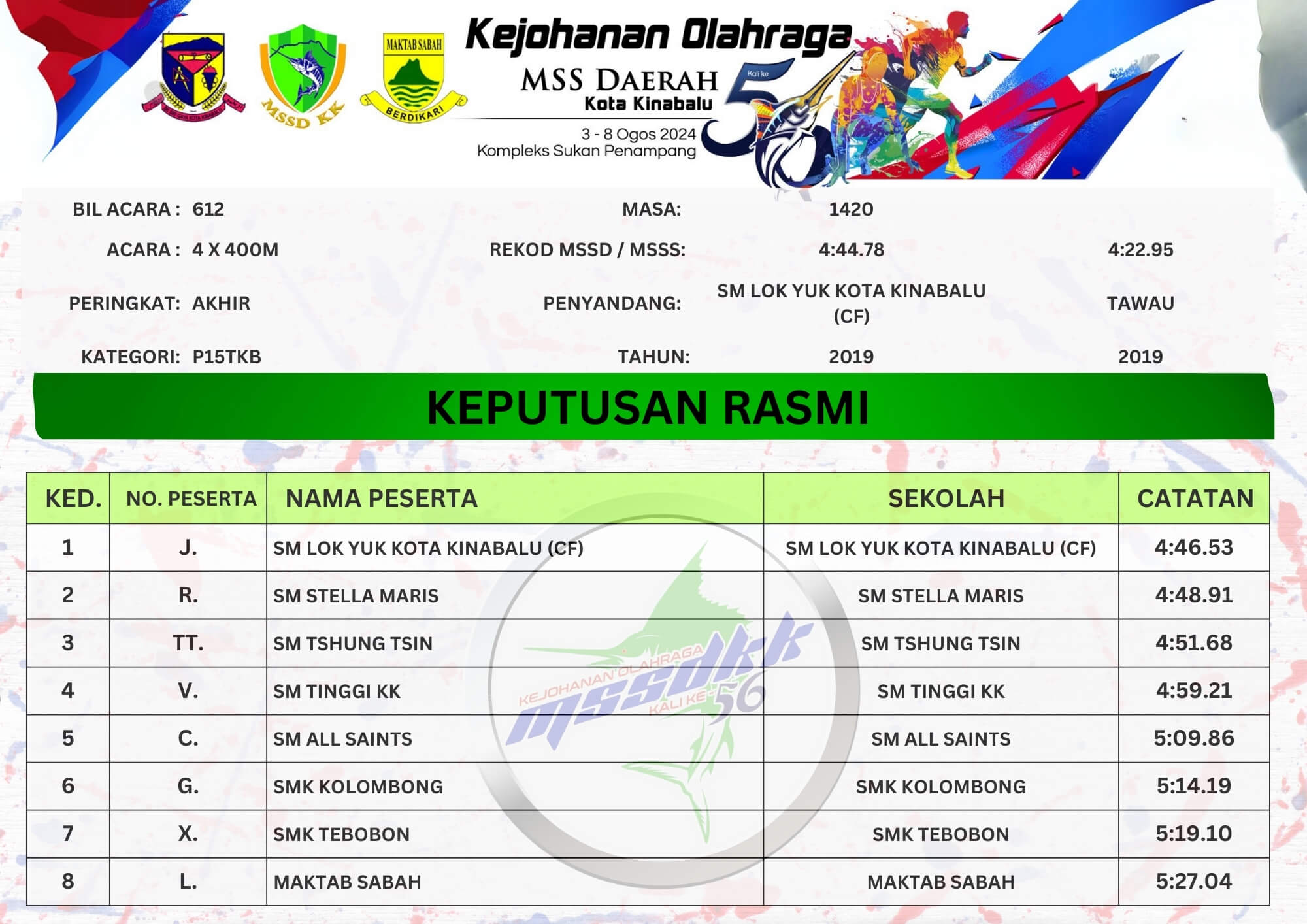 RASMI: 612 – 4 X 400 METER P15AKHIR Date: August 8, 2024 Author: Admin MSSDKK Comments: 0 Comments Categories: 202415TKB, 2024P15TKB, 2024RESULT, 2024RESULTSM Kongsi: