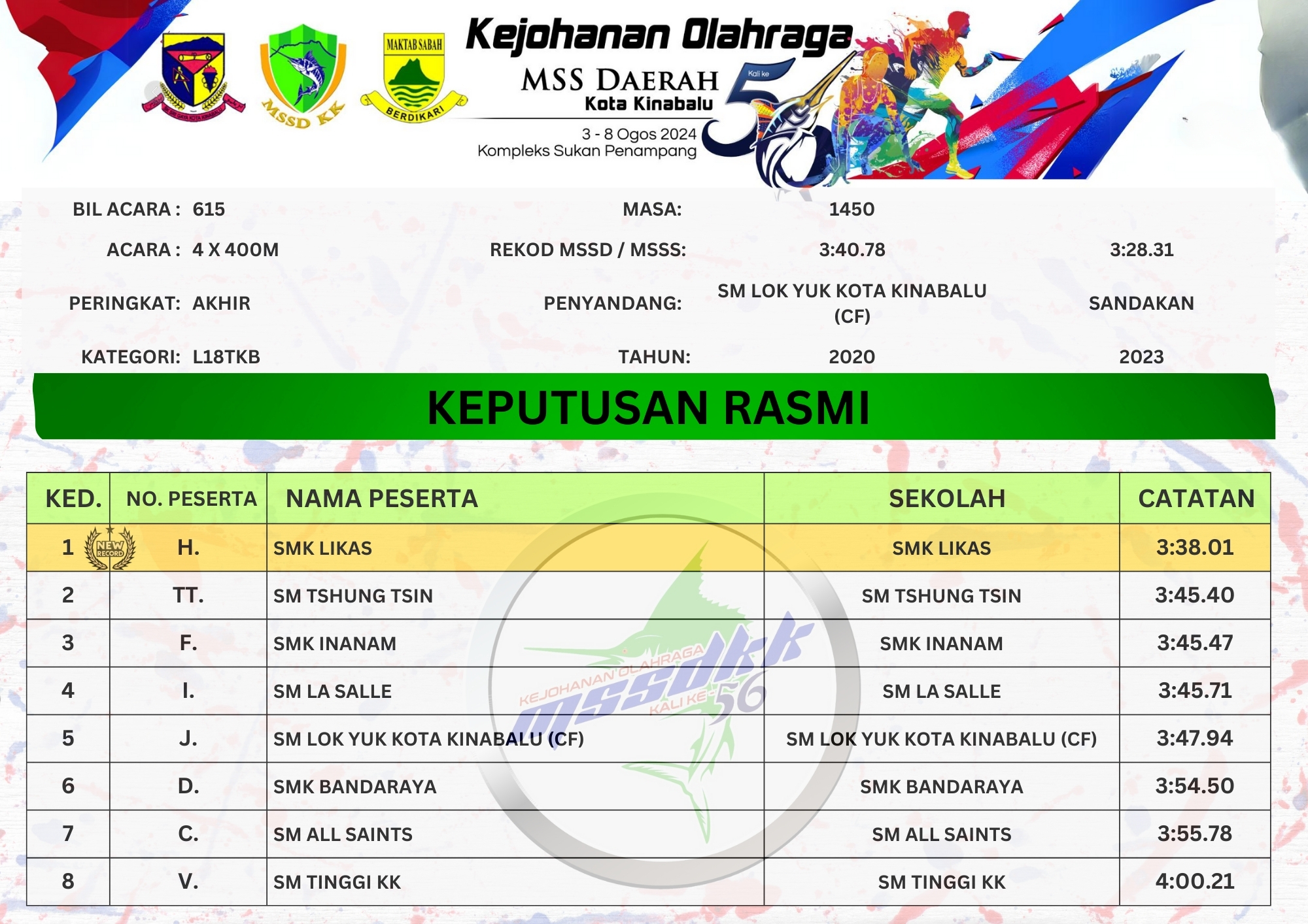 RASMI: 615 – 4 X 400 METER L18AKHIR Date: August 8, 2024 Author: Admin MSSDKK Comments: 0 Comments Categories: 202418TKB, 2024L18TKB, 2024RB, 2024RESULT, 2024RESULTSM Kongsi: